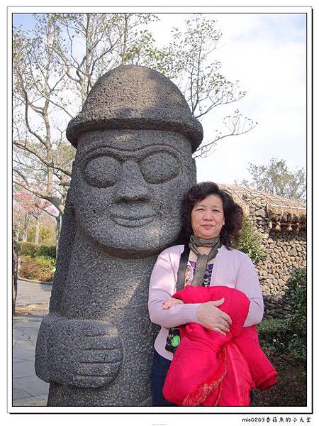 早些年,濟州島是韓國新人熱門的蜜月地點,當時新人多包車由同一位司機兼導遊及攝影師,當時期結婚的新人多在同樣的地點,擺同樣的pose拍照,據說有位調皮的新娘,在擺pose時,不小心把手放在石頭先生的鼻子上,後來回去生下了男孩,之後也有以同樣姿勢的新人,一樣摸鼻子之後生下了男孩,後面便有摸石頭先生的鼻子會生男孩的說法出現了,也難怪蜜月要來濟州島了,這個石頭先生根本是萬能的,想要生男孩摸鼻子,想要生女孩摸嘴巴,想要長壽摸耳朵,想要聰明摸他的頭,想要錢摸他的肚子,姑娘我最愛錢,每張都摸著他的肚子,哈哈。